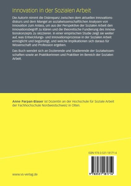 Die Autorin nimmt die Diskrepanz zwischen dem aktuellen Innovationsdiskurs und dem Mangel an sozialwissenschaftlichen Analysen von Innovation zum Anlass, um aus der Perspektive der Sozialen Arbeit den Innovationsbegriff zu klären und die theoretische Fundierung des Innovationskonzepts zu skizzieren. In einer empirischen Studie zeigt sie weiter auf, was Entwicklungs- und Innovationsprozesse in der Sozialen Arbeit ermöglicht und begünstigt, und welche Implikationen sich daraus für Wissenschaft und Profession ergeben.