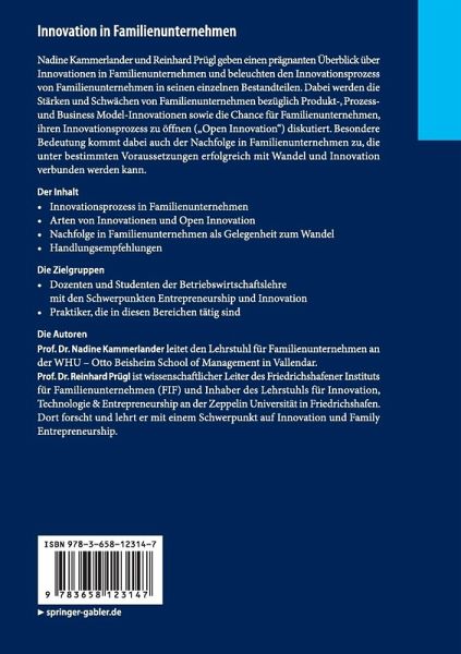 Nadine Kammerlander und Reinhard Prügl geben einen prägnanten Überblick über Innovationen in Familienunternehmen und beleuchten den Innovationsprozess von Familienunternehmen in seinen einzelnen Bestandteilen. Dabei werden die Stärken und Schwächen von Familienunternehmen bezüglich Produkt-, Prozess- und Business Model-Innovationen sowie die Chance für Familienunternehmen, ihren Innovationsprozess zu öffnen ("Open Innovation") diskutiert. Besondere Bedeutung kommt dabei auch der Nachfolge in Familienunternehmen zu, die unter bestimmten Voraussetzungen erfolgreich mit Wandel und Innovation verbunden werden kann.
