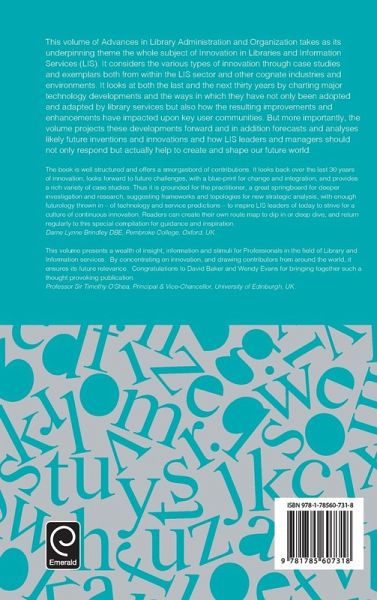 This volume of Advances in Library Administration and Organization takes as its underpinning theme the whole subject of innovation in Library and Information Services. It considers the various types of innovation through case studies and exemplars both from within the LIS sector and other cognate industries and environments.
