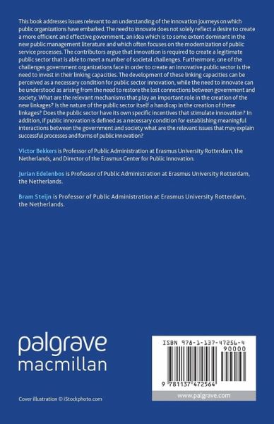 Linking Innovation to the Public Sector: Contexts, Concepts and Challenges; V.Bekkers; J.Edelenbos & B.Steijn Innovation in the Public Sector: An Introductionary Over view; C.Pollit How Common Is Public Sector Innovation and How Similar IS IT to Private Sector Innovation; L.Fuglsang & J.S.Pedersen Small States, Innovation and Administrative Capacity; R.Kattel, T.Randma-Liiv & T.Kalvet Public Sector Innovation at the Urban Level: The Case of Public Procurement; V.Lember, T.Kalvet & R.Kattel Innovation Inside Government: The Importance of Networks; J.M.Lewis, M.Considine & D.Alexander Competing Values in the Management of Innovative Projects: The Case of the RandstadRail Project; H.van der Voort, J.Koppenjan, E.ten Heuvelhof, M.Leijten & W.Veeneman Exploring the Innovative Capacity of Intergovernmental Network Managers: the Art of Boundary Scanning and Boundary Spanning; J.Voets & F.De Rynck Innovating entrepreneurship in health care: How health care executives perceive innovation and retain legitimacy; W.van der Scheer, M.Noordegraaf & P.Meurs An Innovative Public Sector? Embarking on the Innovation Journey; V.Bekkers, J.Edelenbos & B.Steijn