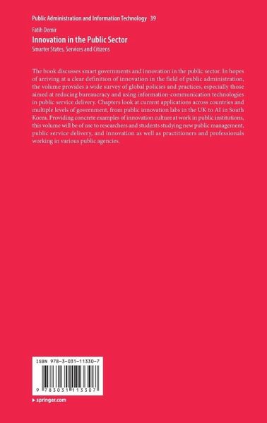 The book discusses smart governments and innovation in the public sector. In hopes of arriving at a clear definition of innovation in the field of public administration, the volume provides a wide survey of global policies and practices, especially those aimed at reducing bureaucracy and using information-communication technologies in public service delivery. Chapters look at current applications across countries and multiple levels of government, from public innovation labs in the UK to AI in South Korea. Providing concrete examples of innovation culture at work in public institutions, this volume will be of use to researchers and students studying new public management, public service delivery, and innovation as well as practitioners and professionals working in various public agencies.