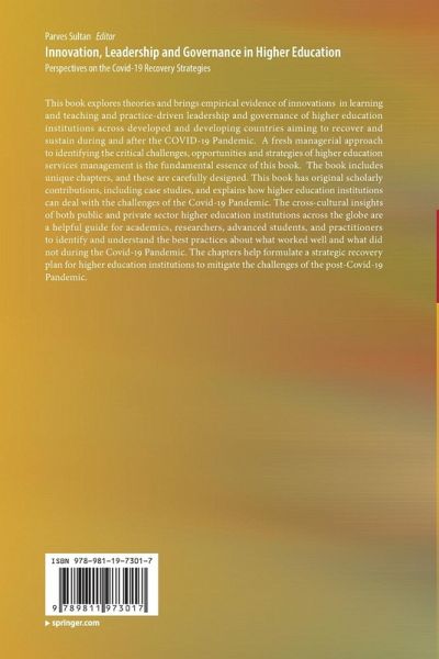 This book explores theories and brings empirical evidence of innovations in learning and teaching and practice-driven leadership and governance of higher education institutions across developed and developing countries aiming to recover and sustain during and after the COVID-19 Pandemic. A fresh managerial approach to identifying the critical challenges, opportunities and strategies of higher education services management is the fundamental essence of this book. The book includes unique chapters, and these are carefully designed. This book has original scholarly contributions, including case studies, and explains how higher education institutions can deal with the challenges of the Covid-19 Pandemic. The cross-cultural insights of both public and private sector higher education institutions across the globe are a helpful guide for academics, researchers, advanced students, and practitioners to identify and understand the best practices about what worked well and what did not during the Covid-19 Pandemic. The chapters help formulate a strategic recovery plan for higher education institutions to mitigate the challenges of the post-Covid-19 Pandemic.
