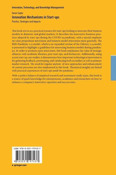 Innovation Mechanisms in Start-ups: Practice, Strategies and Impacts serves as a practical resource for startups looking for innovating their business models in domestic and global markets. This book's main objective is to describe the innovative business practices adopted by startups during the pandemic, with a special emphasis on value proposition innovation and business model innovation more generally. In order to promote open innovation, this book emphasizes the value of strategic alliances with academic libraries, peer startups, and freelancers. Additionally, using actual startup case studies, it was shown how important technological innovation is for gathering feedback, prototyping, and conducting both secondary as well as primary market research. Startups can utilize the technology evaluation and adoption frameworks as a useful reference when choosing a technology to embrace strategically. The need of regularly experimenting with new approaches, learning from mistakes,and enhancing current processes is also emphasized in this book. The ability to dispel falsehoods, capitalize on technological advancements, and form strategic alliances will be essential for innovation even in times of pandemic. This book links theoretical insights with practical experiences of startups amid the pandemic. With a perfect balance of empirical research and assessment study types, this book is a source of quick knowledge for entrepreneurs, academics and researchers on how to enhance a company's innovative capacities and success rates. The BMI-Pandemic 2.15 model, which is an expanded version of the Odyssey 3.14 model, is presented in this book which highlight 15 guidelines to follow in order to innovate business models in pandemics. This book is suitable for Entrepreneurs, Academicians, Researcher and Technologists.