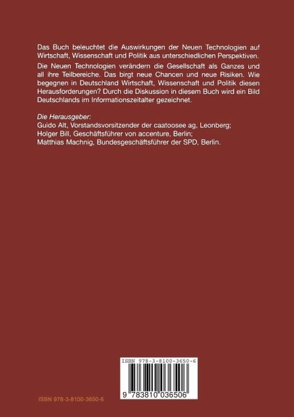 Das Buch beleuchtet die Auswirkungen der Neuen Technologien auf Wirtschaft, Wissenschaft und Politik aus unterschiedlichen Perspektiven. Die Neuen Technologien verändern die Gesellschaft als Ganzes und all ihre Teilbereiche. Das birgt neue Chancen und neue Risiken. Wie begegnen in Deutschland Wirtschaft, Wissenschaft und Politik diesen Herausforderungen? Durch die Diskussion in diesem Buch wird ein Bild Deutschlands im Informationszeitalter gezeichnet.
