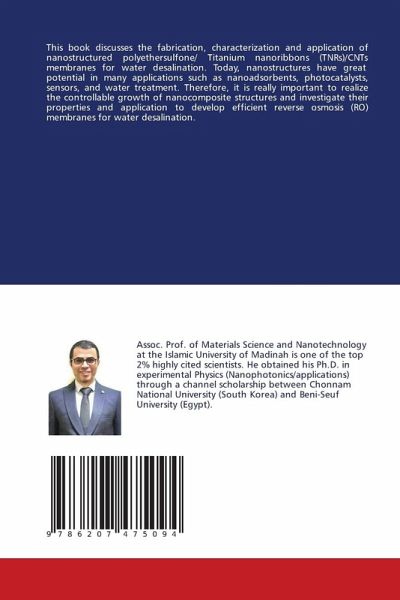 This book discusses the fabrication, characterization and application of nanostructured polyethersulfone/ Titanium nanoribbons (TNRs)/CNTs membranes for water desalination. Today, nanostructures have great potential in many applications such as nanoadsorbents, photocatalysts, sensors, and water treatment. Therefore, it is really important to realize the controllable growth of nanocomposite structures and investigate their properties and application to develop efficient reverse osmosis (RO) membranes for water desalination.