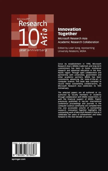 The selected papers are all authored or co-authored by faculty members or students through collaboration with MSRA lab researchers, or with the financial support of MSRA. Papers previously published in top-tier international conference proceedings and journals are compiled here into one accessible volume of outstanding research. Innovation Together highlights the outstanding work of Microsoft Research Asia as it celebrates ten years of achievement and looks forward to the next decade ofsuccess.
