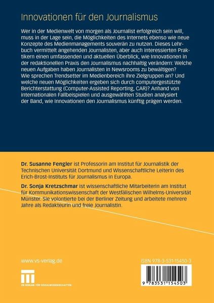 Wer in der Medienwelt von morgen als Journalist erfolgreich sein will, muss in der Lage sein, die Möglichkeiten des Internets ebenso wie neue Konzepte des Medienmanagements souverän zu nutzen. Dieses Lehrbuch vermittelt angehenden Journalisten, aber auch interessierten Praktikern einen umfassenden und aktuellen Überblick, wie Innovationen in der redaktionellen Praxis den Journalismus nachhaltig verändern: Welche neuen Aufgaben haben Journalisten in Newsrooms zu bewältigen? Wie sprechen Trendsetter im Medienbereich ihre Zielgruppen an? Und wie lässt sich im Zeitalter von Google, Photoshop und YouTube Qualität im Journalismus sichern? Anhand von internationalen Fallbeispielen und ausgewählten Studien analysiert der Band, wie Innovationen den Journalismus künftig prägen werden.