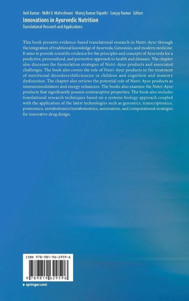 Chapter 1. Translational research in ayurveda: An introduction to evidence-based approaches.- Chapter 2. Translational nutrition and health benefits.- Chapter 3. Emerging opportunities in nutriayur products and supplements.- Chapter 4. Formulations and Challenges of Nutri-Ayur Products Development.- Chapter 5. Global Market Entry Regulation of Nurti-Ayur products.- Chapter 6. Phytomolecular diversity and nutrigrade phytochemicals.- Chapter 7. Role of Nutri-Ayur Product on Nutritional Disorders in Children.- Chapter 8. Nutri-Ayur as Energy Enhancer.- Chapter 9. Nutri-ayur in Cognition and Memory Dysfunction.- Chapter 10. Nutri-ayur as immunity modulator.- Chapter 11. Nutri ayur to enhance aphrodisiac activity.- Chapter 12. Bioavailability of Nutri-Ayur Products - Innovations in Ayurvedic Nutrition.- Chapter 13. Ayurvedic perspective of cancer and the potential of nutri-ayur interventions for the well-being of cancer patients.- Chapter 14. Nutri-Ayur as Contraceptive.- Chapter 15. Intellectual properties rights related to nutri ayur products.