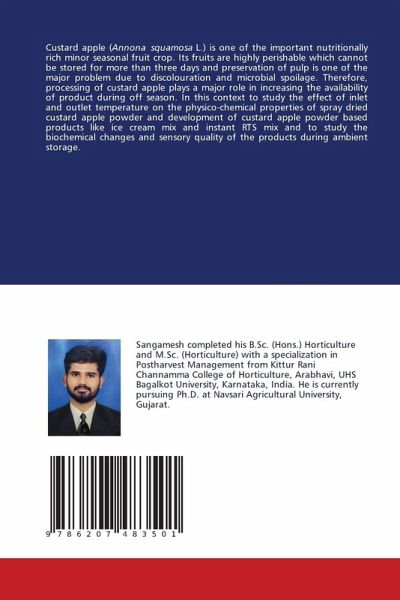 Custard apple (Annona squamosa L.) is one of the important nutritionally rich minor seasonal fruit crop. Its fruits are highly perishable which cannot be stored for more than three days and preservation of pulp is one of the major problem due to discolouration and microbial spoilage. Therefore, processing of custard apple plays a major role in increasing the availability of product during off season. In this context to study the effect of inlet and outlet temperature on the physico-chemical properties of spray dried custard apple powder and development of custard apple powder based products like ice cream mix and instant RTS mix and to study the biochemical changes and sensory quality of the products during ambient storage.