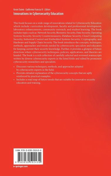 This book focuses on a wide range of innovations related to Cybersecurity Education which include: curriculum development, faculty and professional development, laboratory enhancements, community outreach, and student learning. The book includes topics such as: Network Security, Biometric Security, Data Security, Operating Systems Security, Security Countermeasures, Database Security, Cloud Computing Security, Industrial Control and Embedded Systems Security, Cryptography, and Hardware and Supply Chain Security. The book introduces the concepts, techniques, methods, approaches and trends needed by cybersecurity specialists and educators for keeping current their security knowledge. Further, it provides a glimpse of future directions where cybersecurity techniques, policies, applications, and theories are headed. The book is a rich collection of carefully selected and reviewed manuscripts written by diverse cybersecurity experts in the listed fields and edited by prominent cybersecurityresearchers and specialists.