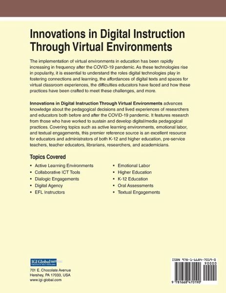 The implementation of virtual environments in education has been rapidly increasing in frequency after the COVID-19 pandemic. As these technologies rise in popularity, it is essential to understand the roles digital technologies play in fostering connections and learning, the affordances of digital texts and spaces for virtual classroom experiences, the difficulties educators have faced and how these practices have been crafted to meet these challenges, and more. Innovations in Digital Instruction Through Virtual Environments advances knowledge about the pedagogical decisions and lived experiences of researchers and educators both before and after the COVID-19 pandemic. It features research from those who have worked to sustain and develop digital/media pedagogical practices. Covering topics such as active learning environments, emotional labor, and textual engagements, this premier reference source is an excellent resource for educators and administrators of both K-12 and higher education, pre-service teachers, teacher educators, librarians, researchers, and academicians.