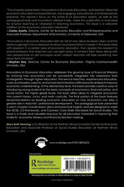 Innovations in Economic Education addresses the growing issue of financial illiteracy by showing how economics can be successfully integrated into classrooms from kindergarten through higher education. Pre-service teachers, experienced educators, curriculum leaders, parents, and school administrators will find practical ideas to improve economic understanding. At the elementary level, the book provides creative ways of introducing young students to the basic concepts of economics, financial justice, and social action. For higher grade levels, the book offers ideas to integrate economics into current history, civics, and math curricula. The final portion of the book features recommendations by leading economic educators on how economics can play a greater role in teachers' professional development. The pedagogical tools presented in each chapter include lesson plans and practical insights, and are designed to meet the NCSS, C3 Framework, and Common Core State Standards for Social Studies. This book is a timely and valuable resource for all educators interested in improving their students' economic literacy and financial decision-making.