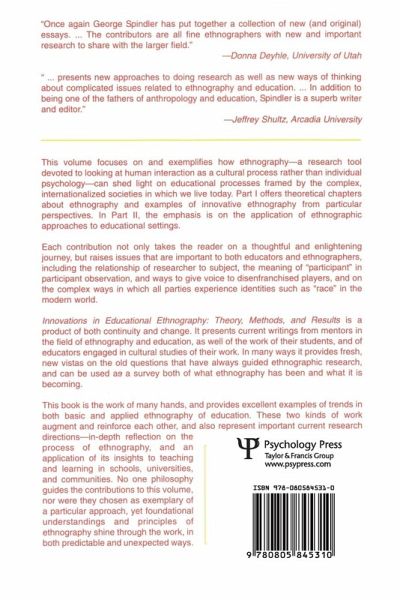 This volume focuses on and exemplifies how ethnography--a research tool devoted to looking at human interaction as a cultural process rather than individual psychology--can shed light on educational processes framed by the complex, internationalized societies in which we live today. Part I offers theoretical chapters about ethnography and examples of innovative ethnography from particular perspectives. In Part II, the emphasis is on the application of ethnographic approaches to educational settings. Each contribution not only takes the reader on a thoughtful and enlightening journey, but raises issues that are important to both educators and ethnographers, including the relationship of researcher to subject, the meaning of "participant" in participant observation, and ways to give voice to disenfranchised players, and on the complex ways in which all parties experience identities such as "race" in the modern world. Innovations in Educational Ethnography: Theory, Methods, and Results is a product of both continuity and change. It presents current writings from mentors in the field of ethnography and education, as well of the work of their students, and of educators engaged in cultural studies of their work. In many ways it provides fresh, new vistas on the old questions that have always guided ethnographic research, and can be used as a survey both of what ethnography has been and what it is becoming. This book is the work of many hands, and provides excellent examples of trends in both basic and applied ethnography of education. These two kinds of work augment and reinforce each other, and also represent important current research directions--in-depth reflection on the process of ethnography itself, and an application of its insights to teaching and learning in schools, universities, and communities. No one philosophy guides the contributions to this volume, nor were they chosen as exemplary of a particular approach, yet foundational understandings and principles of ethnography shine through the work, in both predictable and unexpected ways.