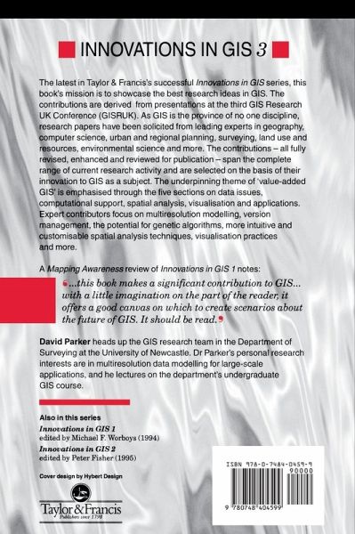 Part 1 Data issues: multi-resolution modelling in Geographical Information Systems; a generic large scale spatial data model for surveyors - changing practices and processes; balancing rights in data - elementary?; georeferencing people and places - a comparison of detailed datasets; the assessment of catchment environmental characteristics and their uncertainty. Part 2 Computational support: version management for GIS in a distributed environment; programming spatial databases - a database object-oriented approach; spatial clustering with a genetic algorithm; applying efficient techniques for finding nearest neighbours in GIS applications; computational techniques for determining three dimensional topology. Part 3 Spatial analysis: user-centred intelligent spatial analyis of point data; developing an exploratory spatial analysis system in XLisp-Stat. Part 4 Visualization: exploring urban development dynamics through visualization and animation; scale-based characterization of Digital Elevation Models; dynamic maps for spatial science - a unified approach to cartographic visualization. Part 5 Applications: precision farming in the office - investigating the development of a GIS-based field information system; modelling air quality and the effects on health in a GIS framework; land-user intentions and land-use modelling.