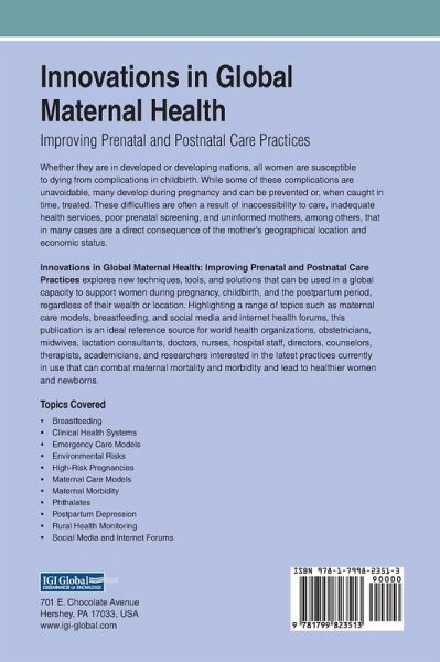 Whether they are in developed or developing nations, all women are susceptible to dying from complications in childbirth. While some of these complications are unavoidable, many develop during pregnancy and can be prevented or, when caught in time, treated. These difficulties are often a result of inaccessibility to care, inadequate health services, poor prenatal screening, and uninformed mothers, among others, that in many cases are a direct consequence of the mother's geographical location and economic status. Innovations in Global Maternal Health: Improving Prenatal and Postnatal Care Practices explores new techniques, tools, and solutions that can be used in a global capacity to support women during pregnancy, childbirth, and the postpartum period, regardless of their wealth or location. Highlighting a range of topics such as maternal care models, breastfeeding, and social media and internet health forums, this publication is an ideal reference source for world health organizations, obstetricians, midwives, lactation consultants, doctors, nurses, hospital staff, directors, counselors, therapists, academicians, and researchers interested in the latest practices currently in use that can combat maternal mortality and morbidity and lead to healthier women and newborns.