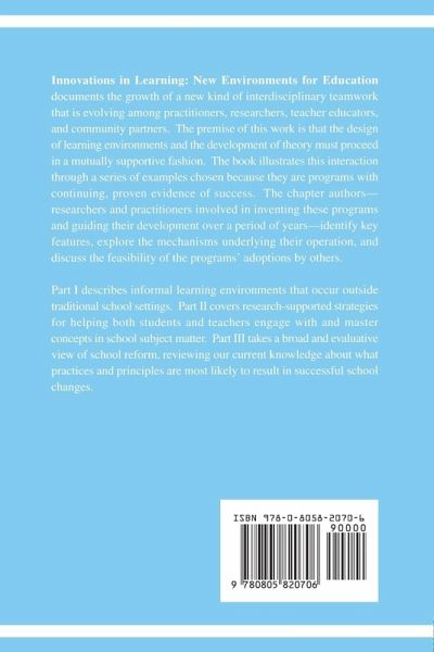 This volume documents the growth of a new kind of interdisciplinary teamwork that is evolving among practitioners, researchers, teacher educators, and community partners. Its premise: the design of learning environments and the development of theory must proceed in a mutually supportive fashion. Scientific researchers have learned that a prerequisite to studying the kinds of learning that matter is helping to shoulder the responsibility for ensuring that these forms of learning occur. To support and study learning, researchers are increasingly making major and long-term investments in the design and maintenance of contexts for learning. Practitioners are assuming new roles as well, reflecting an increasing awareness of the need to move beyond skillful doing. If developing learning contexts are to be protected within and expanded beyond the systems that surround them, it is necessary to foster professional communities that will support reflection about practice, including the generation and evaluation of rich and flexible environments for student thinking. One consequence of recent reforms is that teachers are increasingly regarding such tasks as central to their professional development. Innovations in Learning: New Environments for Education describes coordinated interaction between educational design on the one hand, and the development of learning theory on the other, through a series of examples. These examples have been chosen because they are continuing, proven programs with evidence of success. Contributors to the volume are researchers and practitioners who have played a role in inventing these programs and have guided their development over a period of years. Rather than choosing illustrations of a pipeline or "application model of research" from research and then to practice, the editors of this volume have selected interventions in which researchers and practitioners work together persistently to forge common understanding. Such activity is necessarily interdisciplinary, often encompassing long spans of time, and is more akin to engineering in the field than to laboratory science. The common themes that emerge from this activity -- for example, the role of tools, talk, and community -- belong exclusively neither to theory nor to practice, but to their intersection in commitment to specific contexts of learning and continuing contributions to practice and underlying theory. This volume is organized into three sections that reflect different levels and kinds of learning contexts. Each of these levels has been the focus of recent cognitive and reform applications to learning and schooling. The first offers examples of effective learning in informal settings; the second discusses innovative approaches to schooling at the classroom level; and the third reviews reforms that regard the entire school as the appropriate unit of change.