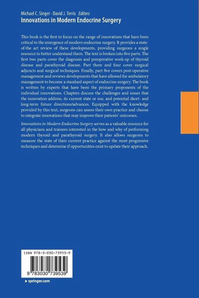 Innovations in Modern Endocrine Surgery serves as a valuable resource for all physicians and trainees interested in the how and why of performing modern thyroid and parathyroid surgery. It also allows surgeons to measure the state of their current practice against the most progressive techniques and determine if opportunities exist to update their approach.