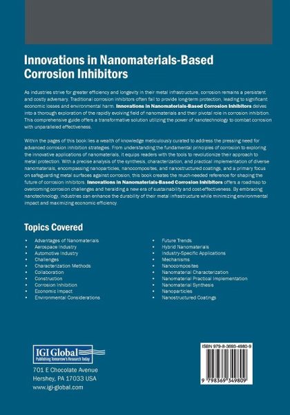 As industries strive for greater efficiency and longevity in their metal infrastructure, corrosion remains a persistent and costly adversary. Traditional corrosion inhibitors often fail to provide long-term protection, leading to significant economic losses and environmental harm. Innovations in Nanomaterials-Based Corrosion Inhibitors delves into a thorough exploration of the rapidly evolving field of nanomaterials and their pivotal role in corrosion inhibition. This comprehensive guide offers a transformative solution utilizing the power of nanotechnology to combat corrosion with unparalleled effectiveness. Within the pages of this book lies a wealth of knowledge meticulously curated to address the pressing need for advanced corrosion inhibition strategies. From understanding the fundamental principles of corrosion to exploring the innovative applications of nanomaterials, it equips readers with the tools to revolutionize their approach to metal protection. With a precise analysis of the synthesis, characterization, and practical implementation of diverse nanomaterials, encompassing nanoparticles, nanocomposites, and nanostructured coatings, and a primary focus on safeguarding metal surfaces against corrosion, this book creates the much-needed reference for shaping the future of corrosion inhibitors. Innovations in Nanomaterials-Based Corrosion Inhibitors offers a roadmap to overcoming corrosion challenges and heralding a new era of sustainability and cost-effectiveness. By embracing nanotechnology, industries can enhance the durability of their metal infrastructure while minimizing environmental impact and maximizing economic efficiency.