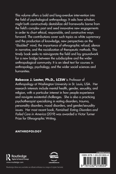 This volume offers a bold and long-overdue intervention into the field of psychological anthropology. It asks how scholars might both constructively destabilize old frameworks borne from the field's complex past and seed innovative new engagements in order to chart ethical, responsible, and constructive ways forward. The contributions cover such topics as white supremacy and the production of knowledge, new perspectives on the "disabled" mind, the importance of ethnographic refusal, silence in narrative, and the racialization of therapeutic methods. This timely book seeks to reinvigorate the field and lay groundwork for a new bridge between the subdiscipline and the wider anthropological community. It is an ideal text for courses in anthropology, psychology, and the wider social sciences and humanities.