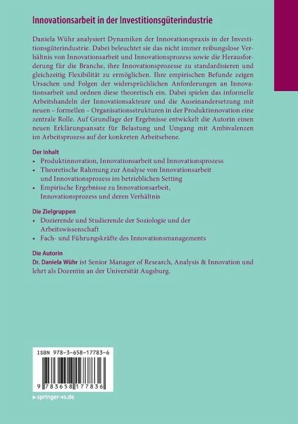 Daniela Wühr analysiert Dynamiken der Innovationspraxis in der Investitionsgüterindustrie. Dabei beleuchtet sie das nicht immer reibungslose Verhältnis von Innovationsarbeit und Innovationsprozess sowie die Herausforderung für die Branche, ihre Innovationsprozesse zu standardisieren und gleichzeitig Flexibilität zu ermöglichen. Ihre empirischen Befunde zeigen Ursachen und Folgen der widersprüchlichen Anforderungen an Innovationsarbeit und ordnen diese theoretisch ein. Dabei spielen das informelle Arbeitshandeln der Innovationsakteure und die Auseinandersetzung mit neuen - formellen - Organisationsstrukturen in der Produktinnovation eine zentrale Rolle. Auf Grundlage der Ergebnisse entwickelt die Autorin einen neuen Erklärungsansatz für Belastung und Umgang mit Ambivalenzen im Arbeitsprozess auf der konkreten Arbeitsebene.