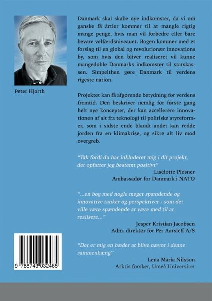 Den bog du læser nu kan få afgørende betydning for verdens fremtid. Den beskriver nemlig for første gang helt nye koncepter, der kan accellerere innovationen af alt fra teknologi til politiske styreformer, som i sidste ende blandt andet kan redde jorden fra en klimakrise, og sikre alt liv mod overgreb. Formålet er at vise hvordan vi i Danmark kan skabe nye indkomster, da vi om ganske få årtier kommer til at mangle rigtig mange penge, hvis man vil forbedre eller bare bevare velfærdsniveauet. Rapporten kommer med et forslag til en global og revolutionær innovationsby, som hvis den bliver realiseret som planlagt vil kunne mangedoble Danmarks indkomster til statskassen - år efter år. Simpelthen gøre Danmark til verdens rigeste nation. Bogen er på den ene side meget visionær, men også meget konkret. Den er simpelthen et blueprint til et færdigt projekt, med eksakte planer for indhold og placering, og oven i købet med finansiering og tidsplan. Der findes nøje udvalgte lister over flere hundrede virksomheder og navngivne personer, som vil blive inviteret med som pionerer til Innovationsbyen. Bogen optegner hovedlinjerne for hvordan vi skal bo sammen i fred - hvordan vi skal løse klima og naturproblemerne - hvordan vi skal styres og styre os selv - og hvordan vi som mennesker bliver lykkelige og produktive.