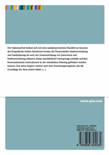 Diplomarbeit aus dem Jahr 2012 im Fachbereich Soziologie - Wirtschaft und Industrie, Note: 1,7, Technische Universität Berlin, Sprache: Deutsch, Abstract: Die Diplomarbeit befasst sich mit dem stadtplanerischem Handeln im Kontext des Tempelhofer Feldes.