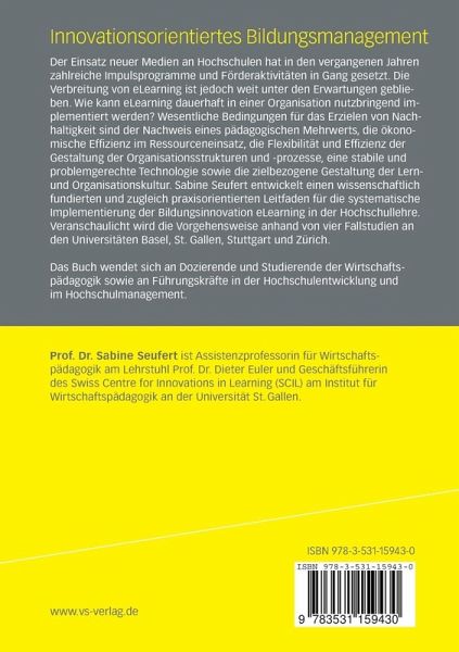 Der Einsatz neuer Medien an Hochschulen hat in den vergangenen Jahren zahlreiche Impulsprogramme und Förderaktivitäten in Gang gesetzt. Die Verbreitung von eLearning ist jedoch weit unter den Erwartungen geblieben. Wie kann eLearning dauerhaft in einer Organisation nutzbringend implementiert werden? Wesentliche Bedingungen für das Erzielen von Nachhaltigkeit sind der Nachweis eines pädagogischen Mehrwerts, die ökonomische Effizienz im Ressourceneinsatz, die Flexibilität und Effizienz der Gestaltung der Organisationsstrukturen und -prozesse, eine stabile und problemgerechte Technologie sowie die zielbezogene Gestaltung der Lern- und Organisationskultur. Sabine Seufert entwickelt einen wissenschaftlich fundierten und zugleich praxisorientierten Leitfaden für die systematische Implementierung der Bildungsinnovation eLearning in der Hochschullehre. Veranschaulicht wird die Vorgehensweise anhand von vier Fallstudien an den Universitäten Basel, St. Gallen, Stuttgart und Zürich.