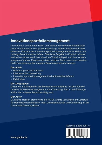 Innovationen sind für den Erhalt und Ausbau der Wettbewerbsfähigkeit eines Unternehmens von großer Bedeutung. Marcel Heesen entwickelt daher ein Konzept des Innovationsportfoliomanagements für kleine und mittelgroße Automobilzulieferer. Sämtliche Projekte im Portfolio können erstmals entsprechend ihrer einzelnen Vorteilhaftigkeit und ihrer Auswirkungen auf andere Projekte priorisiert werden. Damit kann eine zielorientierte Fokussierung der knappen Ressourcen erreicht werden.