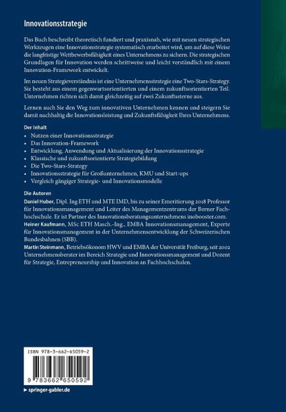 Daniel Huber, Dipl. Ing ETH und MTE IMD, arbeitete bis zu seiner Emeritierung 2018 als Professor für Innovationsmanagement und als Leiter des Managementzentrums der Berner Fachhochschule. Vor seiner Tätigkeit an der Berner Fachhochschule arbeitete er mehr als 20 Jahre bei Swisscom, davon sieben Jahre als stellvertretender Leiter der Innovationsabteilung. Daniel Huber war bis 2021 Co-Präsident von swissfuture, der Vereinigung der Zukunftsforscher der Schweiz, und ist Partner des Innovationsberatungsunternehmens inobooster.com. Er ist Koautor des Buches "Bridging the Innovation Gap - Bauplan des Innovativen Unternehmens" (Springer, 2014). Heiner Kaufmann, MSc ETH Masch.-Ing., EMBA Innovationsmanagement, ist als Experte für Innovationsmanagement in der Unternehmensentwicklung der Schweizerischen Bundesbahnen (SBB) tätig. Zuvor war er Partner der Innovationsberatungsfirma Creaholic SA und Professor für Innovationsmanagement an der Berner Fachhochschule. In den ersten Jahren seiner beruflichen Laufbahn war er Manager und Projektleiter in verschiedenen Hightech-Firmen und Gründer eines Software-Start-ups sowie eines Beratungsunternehmens. Heiner Kaufmann ist Koautor des Buches "Bridging the Innovation Gap - Bauplan des Innovativen Unternehmens" (Springer, 2014). Martin Steinmann, Betriebsökonom HWV und EMBA-Abschluss an der Universität Freiburg am International Institute of Management in Telecommunication (IIMT), arbeitet seit 2002 als selbstständiger Unternehmensberater im Bereich Strategie und Innovationsmanagement. Nebenbei ist er Dozent und Experte für Strategie, Entrepreneurship und Innovationsmanagement an Fachhochschulen. Er verbindet als langjähriger Start-up-Coach theoretisches Wissen mit praktischer Relevanz. Martin Steinmann ist Koautor des Buches "Bridging the Innovation Gap - Bauplan des Innovativen Unternehmens" (Springer, 2014).