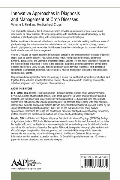 Volume 2 focuses on recent advances in diagnosis, detection, and management of diseases of specific crops, such as cotton, sesame, rice, wheat, millet, maize, field pea and pigeonpea, ginger and turmeric, guava, aonla, and vegetable cruciferous crops.