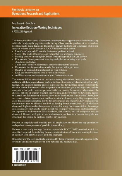 This book provides a blend of quantitative and qualitative approaches to decision making, while also bridging the gap between the theory of how to make good decisions versus how people actually make decisions. The authors present the tools and techniques of decision analysis to learn how to become a FOCCUSSED decision maker: