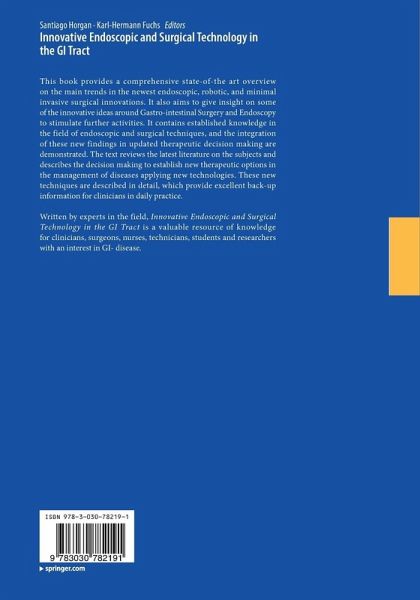 This book provides a comprehensive state-of-the art overview on the main trends in the newest endoscopic, robotic, and minimal invasive surgical innovations. It also aims to give insight on some of the innovative ideas around Gastro-intestinal Surgery and Endoscopy to stimulate further activities. It contains established knowledge in the field of endoscopic and surgical techniques, and the integration of these new findings in updated therapeutic decision making are demonstrated. The text reviews the latest literature on the subjects and describes the decision making to establish new therapeutic options in the management of diseases applying new technologies. These new techniques are described in detail, which provide excellent back-up information for clinicians in daily practice. Written by experts in the field, Innovative Endoscopic and Surgical Technology in the GI Tract is a valuable resource of knowledge for clinicians, surgeons, nurses, technicians, students and researchers with an interest in GI- disease.