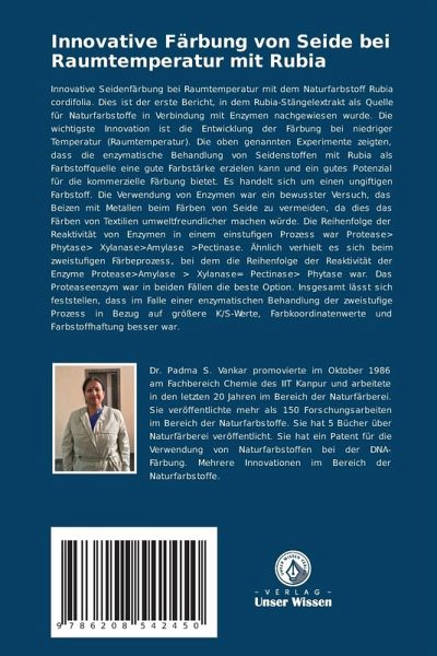 Innovative Seidenfärbung bei Raumtemperatur mit dem Naturfarbstoff Rubia cordifolia. Dies ist der erste Bericht, in dem Rubia-Stängelextrakt als Quelle für Naturfarbstoffe in Verbindung mit Enzymen nachgewiesen wurde. Die wichtigste Innovation ist die Entwicklung der Färbung bei niedriger Temperatur (Raumtemperatur). Die oben genannten Experimente zeigten, dass die enzymatische Behandlung von Seidenstoffen mit Rubia als Farbstoffquelle eine gute Farbstärke erzielen kann und ein gutes Potenzial für die kommerzielle Färbung bietet. Es handelt sich um einen ungiftigen Farbstoff. Die Verwendung von Enzymen war ein bewusster Versuch, das Beizen mit Metallen beim Färben von Seide zu vermeiden, da dies das Färben von Textilien umweltfreundlicher machen würde. Die Reihenfolge der Reaktivität von Enzymen in einem einstufigen Prozess war Protease> Phytase> Xylanase>Amylase >Pectinase. Ähnlich verhielt es sich beim zweistufigen Färbeprozess, bei dem die Reihenfolge der Reaktivität der Enzyme Protease>Amylase > Xylanase= Pectinase> Phytase war. Das Proteaseenzym war in beiden Fällen die beste Option. Insgesamt lässt sich feststellen, dass im Falle einer enzymatischen Behandlung der zweistufige Prozess in Bezug auf größere K/S-Werte, Farbkoordinatenwerte und Farbstoffhaftung besser war.