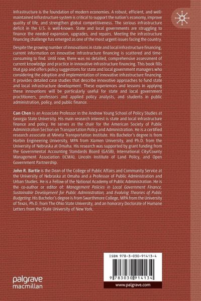 Despite the growing number of innovations in state and local infrastructure financing, current information on innovative infrastructure financing is scattered and time-consuming to find. Until now, there was no detailed, comprehensive assessment of current knowledge and practice in innovative infrastructure financing. This book fills that gap and offers policy suggestions for state and local government managers who are considering the adoption and implementation of innovative infrastructure financing. It provides detailed case studies and rich examples that describe innovative approaches to fund state and local infrastructure development. These experiences and lessons in applying these innovations will be particularly useful for state and local government practitioners, professors, applied policy analysts, and students in public administration, policy, and public finance.