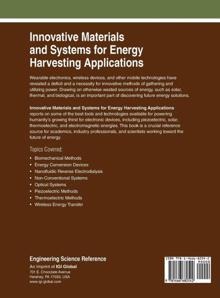 Wearable electronics, wireless devices, and other mobile technologies have revealed a deficit and a necessity for innovative methods of gathering and utilizing power. Drawing on otherwise wasted sources of energy, such as solar, thermal, and biological, is an important part of discovering future energy solutions. Innovative Materials and Systems for Energy Harvesting Applications reports on some of the best tools and technologies available for powering humanity's growing thirst for electronic devices, including piezoelectric, solar, thermoelectric, and electromagnetic energies. This book is a crucial reference source for academics, industry professionals, and scientists working toward the future of energy.