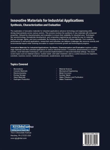 The exploration of innovative materials for industrial applications advance technology and engineering while driving improvements across various sectors. This process involves the synthesis of new materials with enhanced properties, followed by characterization and evaluation to ensure their suitability for industrial uses. Techniques like nanotechnology, biomaterials development, and composites engineering are paving the way for materials that are stronger, lighter, and more sustainable. By focusing on the lifecycle of these materials, from creation to performance in real-world applications, researchers and industries can address challenges like resource scarcity and environmental impact while fostering innovation to support economic growth and technological progress. Innovative Materials for Industrial Applications: Synthesis, Characterization and Evaluation explores cutting-edge materials and their potential applications in various industrial sectors. It examines advancements in materials science, novel fabrication techniques, and successful implementation in real-world industrial settings. This book covers topics such as material science, nuclear waste, and water treatment, and is a useful resource for engineers, scientists, business owners, medical professionals, academicians, and researchers.
