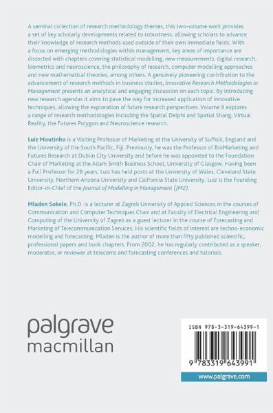 A seminal collection of research methodology themes, this two-volume work provides a set of key scholarly developments related to robustness, allowing scholars to advance their knowledge of research methods used outside of their own immediate fields. With a focus on emerging methodologies within management, key areas of importance are dissected with chapters covering statistical modelling, new measurements, digital research, biometrics and neuroscience, the philosophy of research, computer modelling approaches and new mathematical theories, among others. A genuinely pioneering contribution to the advancement of research methods in business studies, Innovative Research Methodologies in Management presents an analytical and engaging discussion on each topic. By introducing new research agendas it aims to pave the way for increased application of innovative techniques, allowing the exploration of future research perspectives. Volume II explores a range of research methodologies including the Spatial Delphi and Spatial Shang, Virtual Reality, the Futures Polygon and Neuroscience research.