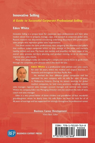 Innovative Selling is a unique book for corporate sales professionals and their sales leaders about how to prepare, manage, cope, and succeed at corporate global sales. Recent research has discovered concerning underlying discontent with professional sales people who represent global sales organizations. This book assists the sales professionals with navigating the dilemmas and pitfalls that confront today's corporate sellers so they emerge at the other end mentally healthy, skilled, and sane. The book also tackles and simplifies the basic steps of the overall sales process, territory planning, and product training, so as to ultimately improve your sales results. Many sales people today are looking for a simple and concise book to guide them through the corporate sales process-this is the book for you.