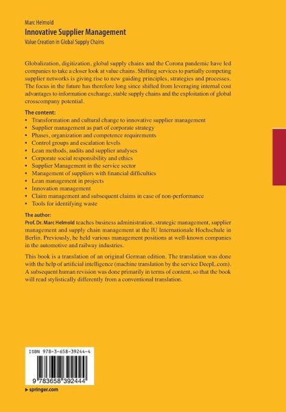 Globalization, digitization, global supply chains and the Corona pandemic have led companies to take a closer look at value chains. Shifting services to partially competing supplier networks is giving rise to new guiding principles, strategies and processes. The focus in the future has therefore long since shifted from leveraging internal cost advantages to information exchange, stable supply chains and the exploitation of global cross-company potential. This book uses innovative, digital and strategic examples to show how successful supplier management must function and act.