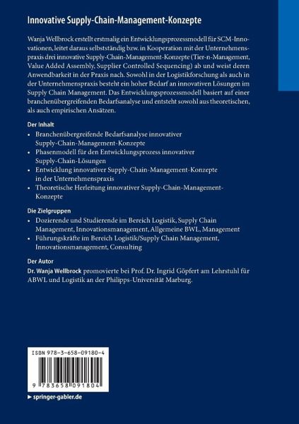 Wanja Wellbrock erstellt erstmalig ein Entwicklungsprozessmodell für SCM-Innovationen, leitet daraus selbstständig bzw. in Kooperation mit der Unternehmenspraxis drei innovative Supply-Chain-Management-Konzepte (Tier-n-Management, Value Added Assembly, Supplier Controlled Sequencing) ab und weist deren Anwendbarkeit in der Praxis nach. Sowohl in der Logistikforschung als auch in der Unternehmenspraxis besteht ein hoher Bedarf an innovativen Lösungen im Supply Chain Management. Das Entwicklungsprozessmodell basiert auf einer branchenübergreifenden Bedarfsanalyse und entsteht sowohl aus theoretischen, als auch empirischen Ansätzen.