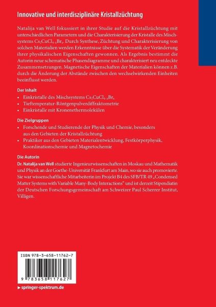 Einleitung.- Stand der Forschung.- Grundlagen.- Charakterisierungsmethoden.- Ergebnisse der Züchtung für das Mischsystem Cs 2 CuCl 4-x Br x .- Röntgenpulverdiffraktometrie bei tiefen Temperaturen.- Physikalische Eigenschaften der orthorhombischen und tetragonalen Phase des Mischsystems.- Einkristalle mit Kronenethermolekülen: Züchtung und Eigenschaften.- Zusammenfassung.