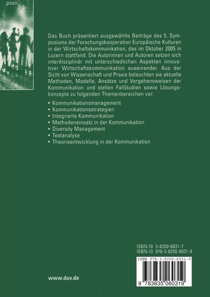 Das Buch präsentiert ausgewählte Beiträge des 5. Symposiums der Forschungskooperation Europäische Kulturen in der Wirtschaftskommunikation, das im Oktober 2005 in Luzern stattfand. Die Autorinnen und Autoren setzen sich interdisziplinär mit unterschiedlichen Aspekten innovativer Wirtschaftskommunikation auseinander. Aus der Sicht von Wissenschaft und Praxis beleuchten sie aktuelle Methoden, Modelle, Ansätze und Vorgehensweisen der Kommunikation und stellen Fallstudien sowie Lösungskonzepte zu folgenden Themenbereichen vor: