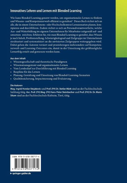 Wie kann Blended Learning genutzt werden, um organisationales Lernen zu fördern und Wissens- und Kompetenzerwerb effizient zu gestalten? Dieses Buch richtet sich an alle, die in einem Unternehmens- oder Hochschulkontext Lernszenarien planen, konzipieren und durchführen. Zudem richtet es sich an Personalverantwortliche, welche Aus- und Weiterbildung im eigenen Unternehmen für Mitarbeiter zeitgemäß auf- und umsetzen möchten. Erfahren Sie, wie man Blended Learning so gestaltet, dass Wissen je nach Inhalt, Problemstellung, Schwierigkeitsgrad und Zielgruppe im Unternehmen strukturiert und systematisiert an die anvisierten Zielgruppen weitergegeben wird. Dabei gehen die Autoren versiert und praxisbezogen insbesondere auf Kompetenzerwerb und Learning Outcomes ein, damit in der Umsetzung der größtmögliche Lernerfolg erzielt und gemessen werden kann.