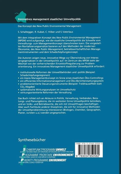 Mit dem integrativen Konzept des New Public Environmental Management (NPEM) wird aufgezeigt, wie die staatliche Umweltpolitik die Schwelle vom Verwaltungs- zum Managementkonzept überschreiten kann. Die vorgestellten Revitalisierungsansätze basieren auf den Methoden der modernen Ökonomie, des New Public Management, betriebswirtschaftlichen Managementinstrumenten und dem Schadschöpfungskonzept. Die Autoren zeigen neue, innovative Wege zur Überwindung von Interessengegensätzen in der Umweltpolitik auf. Im Zentrum des NPEM steht der Wechsel von der vorherrschenden Einzelstoffregulierung zur Problemorientierung. Ein innovatives Management staatlicher Umweltpolitik erfordert: institutionelle Reformen der Umweltbehörden und -politik (Beispiel: Schadschöpfungsregionen) ein klares Managementkonzept im Sinne eines staatlichen Öko-Controllings ein effizientes Informationsmanagement und Öko-Berichterstattungssystem problemorientierte Steuerungsinstrumente (Beispiel: Treibhauseffekt statt CO2- Abgabe) systematische Wirkungsanalysen im Umweltschutz wirkungsorientierte Reformen der Verwaltung. Das Buch richtet sich an Akteure in Politik, Verwaltung, Verbänden, Beratungs- und Planungsbüros, die im weitesten Sinne Umweltpolitik betreiben und an Volks- und Betriebswirte, die sich mit Umweltfragen beschäftigen. Aber auch Fachleute anderer Disziplinen, die sich für innovative Methoden der Umweltproblemlösung interessieren (Biologen, Chemiker, Geographen, Juristen u.a.) werden angesprochen.