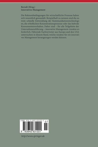 Die Rahmenbedingungen für wirtschaftliche Prozesse haben sich wesentlich gewandelt. Beispielhaft zu nennen sind die extrem schnelle Entwicklung der Kommunikationstechnologien, die erheblichen Konzentrationsprozesse oder das hybride Konsumentenverhalten. Daher sind - für alle Teilgebiete der Unternehmensführung - innovative Management-Ansätze erforderlich. Führende Fachvertreter aus Europa und den USA untersuchen in diesem Band, welche Ansätze für ein innovatives Management herangezogen werden können.