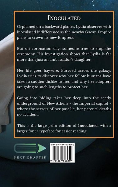 Orphaned on a backward planet, Lydia observes with inoculated indifference as the nearby Gaean Empire plans to crown its new Empress. But on coronation day, someone tries to stop the ceremony. His investigation shows that Lydia is far more than just an ambassador's daughter. Her life goes haywire. Pursued across the galaxy, Lydia tries to discover why her fellow humans have taken a sudden dislike to her, and why her adopters are going to such lengths to protect her. Going into hiding takes her deep into the seedy underground of New Athens - the Imperial capitol - where the secrets of her past lie, her parents' deaths no accident. This is the large print edition of Inoculated, with a larger font / typeface for easier reading.