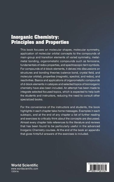 This book focuses on molecular shapes, molecular symmetry, application of molecular orbital concepts to the compounds of main-group and transition elements of varied symmetry, metal-metal bonding, organometallic compounds such as ferrocene, fundamentals of redox properties, and spectroscopic term symbols. For compounds of d-block elements, it delves into discussions on structures and bonding theories (valence bond, crystal field, and molecular orbital), properties (magnetic, spectral, and redox), and reactivities. Basics and applications of organometallic compounds of d-block elements in catalysis and selected topics of bioinorganic chemistry have also been included. An attempt has been made to integrate selected focused topics, which is expected to help both the students and instructors, reducing the need to consult other specialized books. For the convenience of the instructors and students, the book highlights in each chapter take home messages. Examples in each subtopic, and at the end of any chapter a list of further reading and exercises to critically think about the concepts are discussed. Almost every chapter lists references to the literature and reviews that has been found to be particularly useful in the advanced Inorganic Chemistry courses. At the end of the book an appendix that gives hints/full answers of the exercises is included.