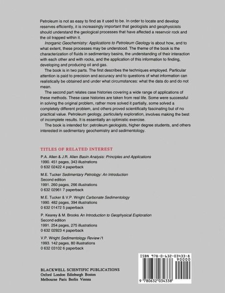 Petroleum is not as easy to find as it used to be. In order to locate and develop reserves efficiently, it's vital that geologists and geophysicists understand the geological processes that affect a reservoir rock and the oil that is trapped within it. This book is about how and to what extent, these processes may be understood. The theme of the book is the characterization of fluids in sedimentary basins, understanding their interaction with each other and with rocks, and the application of this information to finding, developing and producing oil and gas. The first part of the book describes the techniques, and the second part relates real-life case histories covering a wide range of applications. Petroleum geology, particularly exploration, involves making the best of incomplete results. It is essentially an optimistic exercise. This book will remove some of the guesswork. * * Brings together the most important geochemical methods in a single volume. * Authored by two well-respected researchers in the oil industry. * Real-life, international case histories.