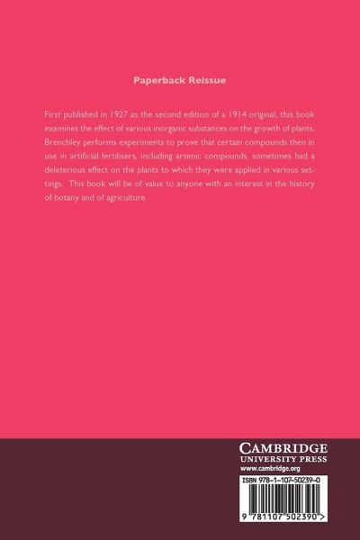 First published in 1927 as the second edition of a 1914 original, this book examines the effect of various inorganic substances on the growth of plants. Brenchley performs experiments to prove that certain compounds then in use in artificial fertilisers, including arsenic compounds, sometimes had a deleterious effect on the plants to which they were applied in various settings. This book will be of value to anyone with an interest in the history of botany and of agriculture.