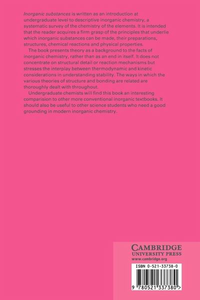 Inorganic Substances is complementary in its approach to conventional inorganic chemistry textbooks. Written with the undergraduate in mind, it gives an introduction to descriptive inorganic chemistry, a systematic survey of the chemistry of the elements according to the Periodic Classification. In this way, the reader acquires a firm grasp of the principles which underlie which inorganic substances can be made, their preparations, structures, chemical reactions and physical properties. The book presents theory as a background to the facts of inorganic chemistry, rather than as an end in itself. It does not concentrate on structural detail or reaction mechanisms but stresses the interplay between thermodynamic and kinetic considerations in understanding stability. The ways in which the various theories of structure and bonding are related are thoroughly dealt with throughout. The approach of this book makes it a useful companion to any intermediate inorganic chemistry course. It should also be useful to other science students, especially earth and material scientists who need a good grounding in modern inorganic chemistry.